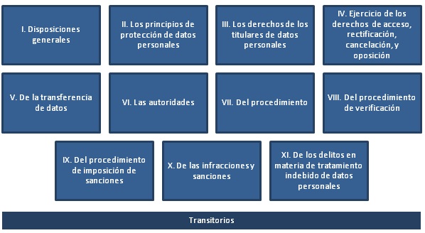 La LFPDPPP consta de 69 artículos organizados en 11 capítulos, como sigue: