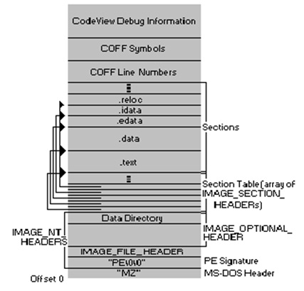 Como se puede observar, un PE contiene diversas partes como los encabezados y secciones, las cuales son una liga dinámica del mapa del archivo en memoria; por ejemplo, la sección .data contiene las variables globales del programa.–Para un mayor detalle se puede revisar la documentación de Microsoft 1. —