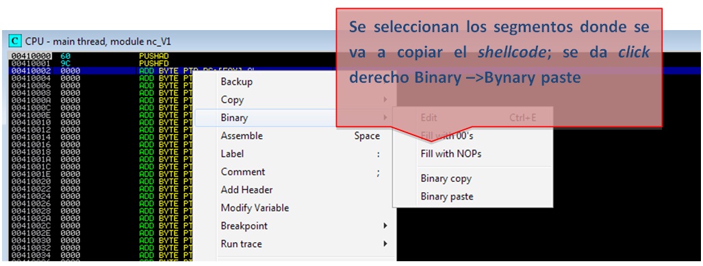 Ahora copiemos en los siguientes registros nuestro shellcode: