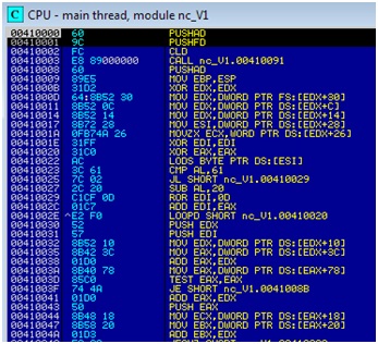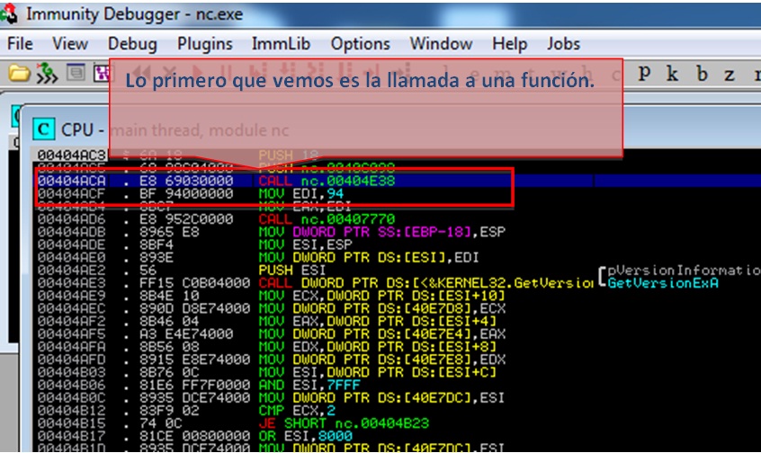 Nota: Les aconsejo buscar la instrucción JMP EAX, ahí colocar un breakpoint y observar cómo va haciendo la llamada a las diferentes funciones al ejecutar el programa con F7”