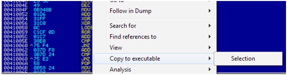 Nota: siempre que hagamos un cambio en el PE se debe guardar seleccionando los cambios y dando click derecho ->Copy to executable->Selection; esto abrirá un nuevo apartado en el cual “damos guardar” con lo que se genera un nuevo exe.