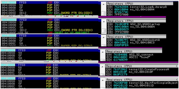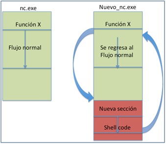 Lo que se hará es modificar el PE original insertando una serie de sentencias que hacen que el equipo donde se ejecuta –en este caso el NetCat modificado–haga una conexión remota a un equipo y ofrezca un command prompt (cmd); a esto comúnmente se le conoce como reverse shell.