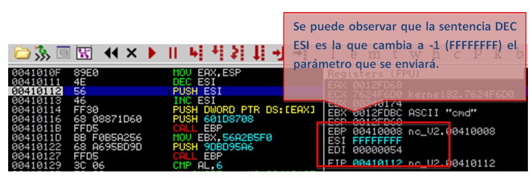 La primera condición de ciclo la vamos a quitar buscando en qué momento nuestro shellcode hace llamada a la función “WaitForSingleObject 4”, la cual es una función que se llama cuando se abre un socket en un equipo, por defecto se envía el parámetro “-1” — o en hexadecimal FFFFFFFF—lo cual pone la ejecución del shellcode en un ciclo hasta que se cierre la conexión inversa. Para poder detectar esto se tiene que ejecutar paso a paso el shellcode y validar en qué momento se llama la función. La siguiente imagen ilustra lo anterior: