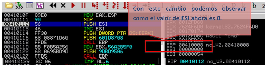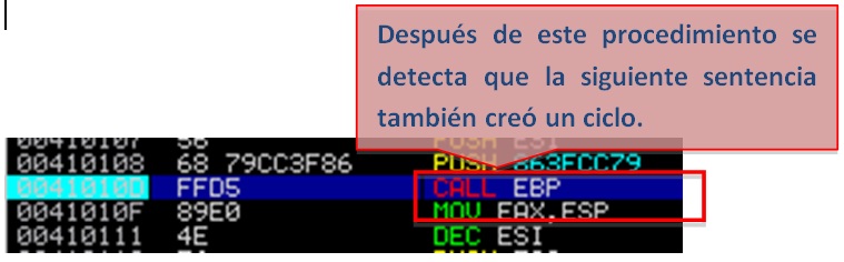 Por medio de este pequeño cambio se ha logrado suprimir el primer ciclo, ahora se tiene que comprobar si el propio código del shellcode no hace una llamada a sí mismo que lo lleve a esta condición. Nuevamente es necesario que ejecutar el shellcodepaso a paso.