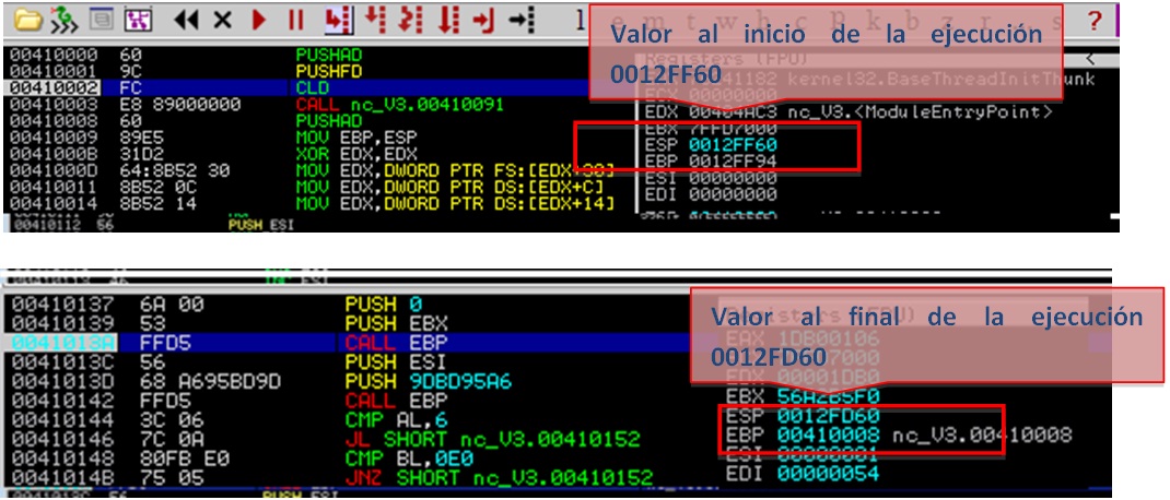 Lo primero es comprobar los valores del registro ESP cuando inició la ejecución del shellcode y su valor al finalizar.