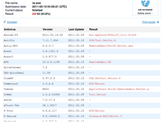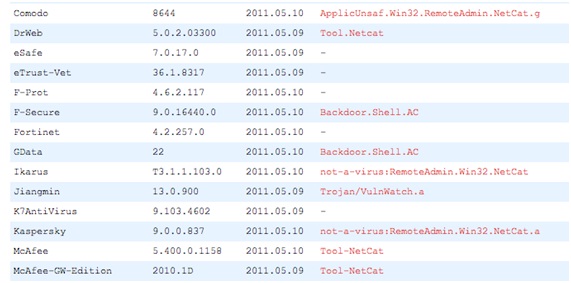 Algunos antivirus lo comienzan a detectar como backdoor y no como NetCat; sin embargo lo más preocupante es que existen todavía algunos antivirus que no han dado cuenta del código malicioso 5.
