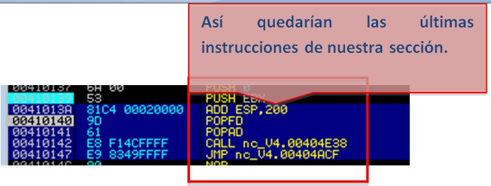 - Agregar las dos instrucciones que se modificaron al inicio del PE original con el fin de alterar el flujo.