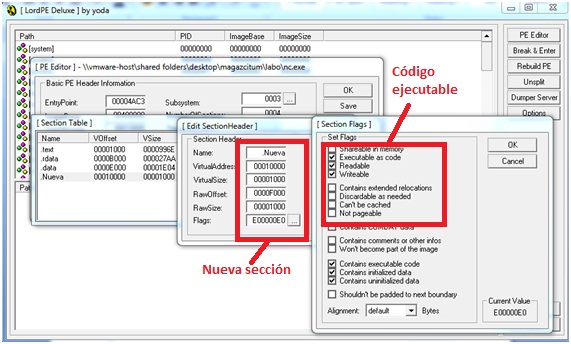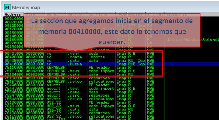 Al contar ya con el código que vamos a usar, lo siguiente es inyectarlo en el programa nc; para lograrlo crearemos una nueva sección en el PE a través de LordPE.