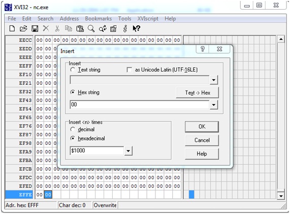 Para corregirlo se agregan datos a esta nueva sección por medio del editor hexadecimal, se abre el nuevo archivo nc y al final del mismo se agregan los datos tal como la imagen lo muestra— es aquí donde se creó nuestra nueva sección—y agregamos los datos nulos.