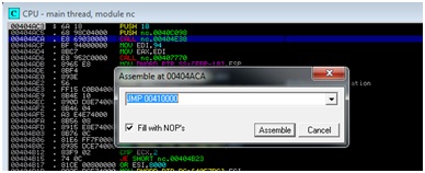Lo siguiente es cambiar la llamada a función por un salto (JUMP) al segmento de memoria donde inicia nuestra sección (en este caso OO41OOOO) y donde se colocará el shellcode.
