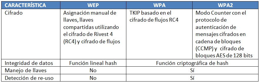 La siguiente tabla concentra las diferencias entre estas modalidades de protección de soluciones de tecnología inalámbrica, comparando sus capacidades de cifrado de información, la integridad de los datos que transportan, el manejo de llaves para los procesos de encripción y la detección de reutilización de llaves: