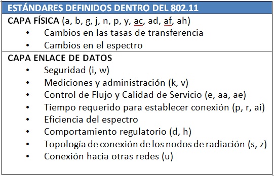 En la siguiente tabla enumero algunas de las presentes y futuras innovaciones que se estarán viendo dentro de las definiciones del estándar 802.11: