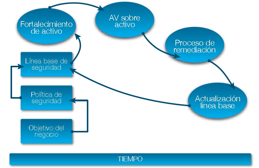 Cada entrada tiene un origen en común: cumplir los objetivos del negocio; deben basarse en una política de seguridad institucional e incluso tener un tratamiento diferente y ejecutarse en tiempos distintos ¿A qué me refiero con esto?, antes de salir a producción, cualquier sistema debería pasar por un proceso de fortalecimiento que le permita cumplir con la líneas base de seguridad establecida de acuerdo a su tipo. Tiempo después es fundamental que la organización mida si esta línea base de seguridad sigue cumpliendo con su objetivo primordial y para ello puede ejecutar estudios de análisis de vulnerabilidades, los cuales alimentan tanto el proceso de remediación como el proceso de fortalecimiento y la actualización de la línea base de seguridad.