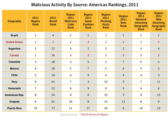 Symantec Corporation – Actividad maliciosa por país, las Américas, 2011