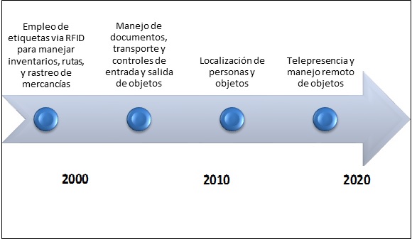 El siguiente gráfico muestra un breve recuento de lo que se ha presentado en el Internet de las cosas a partir de 1999, que fue cuando se acuñó este término. La evolución ha pasado por solventar necesidades de las organizaciones, como la reducción de los tiempos de operación y costos, la incorporación de tecnología inalámbrica, geolocalización y la disminución de tamaño de las soluciones, hasta el desarrollo de aplicaciones personalizadas para fines muy diversos.