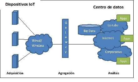En una topología tipo del Internet de las cosas encontraremos al dispositivo que se puede comunicar a través de una red cableada o inalámbrica y, de ahí, conectada a una nube pública como Internet, o privada como la red corporativa de su organización. El siguiente gráfico muestra este planteamiento: