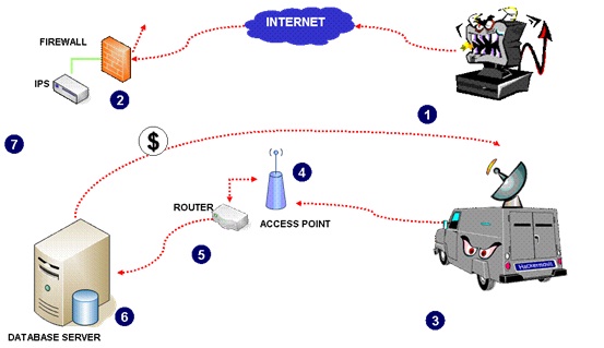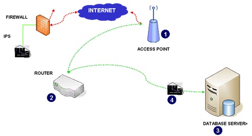 En este escenario, el “War Driving” ya no surtirá efecto pues la red inalámbrica tiene varios controles (1) para evitarlo; pero si algo fallara en la configuración de access points, entonces los filtros (o ACL) en los ruteadores frenarían el ataque (2); si los dos controles anteriores no fueran suficientes, ahora el servidor y el DBMS han sido correctamente configurados (3), y adicionalmente se pudo haber implementado un firewall de base de datos (4).