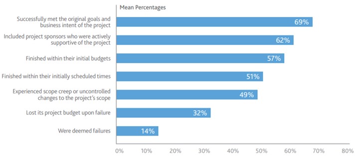 Resultados de los proyectos evaluados por el PMI en el periodo del estudio; la barra superior se refiere al porcentaje de proyectos exitosos, 69%. (REF. PMI Pulse of the profession, 9th Global Project Management Survey 2017).