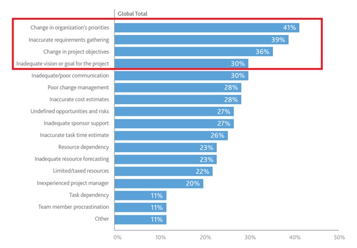 Gráfica que muestra las principales problemáticas que inciden en los proyectos, donde se identifican en el recuadro rojo las áreas de oportunidad con mayor incidencia, las cuales están relacionadas con una correcta definición del propósito, alcance y objetivos. (REF. PMI Pulse of the profession, 9th Global Project Management Survey 2017).