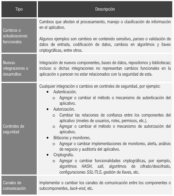Debido a que es imposible documentar una lista completa de todos los tipos de cambios que llevan a un nuevo MA, se recomienda que la lista sugerida anteriormente sirva como referencia y sea complementada de acuerdo con las necesidades particulares de cada organización. En algunos casos, la ejecución podría confirmar que el MA anterior aún es vigente, es decir, que los cambios realizados al aplicativo no derivaron en posibles nuevas amenazas.
