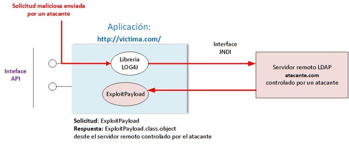 Dado que típicamente las bitácoras contienen datos insertados por los usuarios; los atacantes pueden insertar solicitudes de JNDI en un mensaje que será procesado en las bitácoras de la aplicación para que apunten a servidores LDAP que ellos controlen y que contengan clases JAVA programadas para ejecutar las acciones maliciosas que los atacantes requieran.