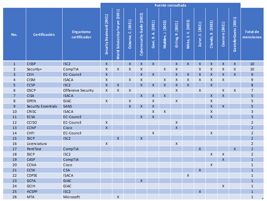 A manera de guía para el lector, recopilé la siguiente tabla de las certificaciones más recomendadas en el mundo de la ciberseguridad (la información fue obtenida de diversas páginas de Internet, elegidas al azar desde una búsqueda con Google):