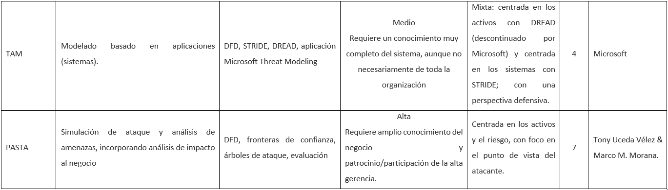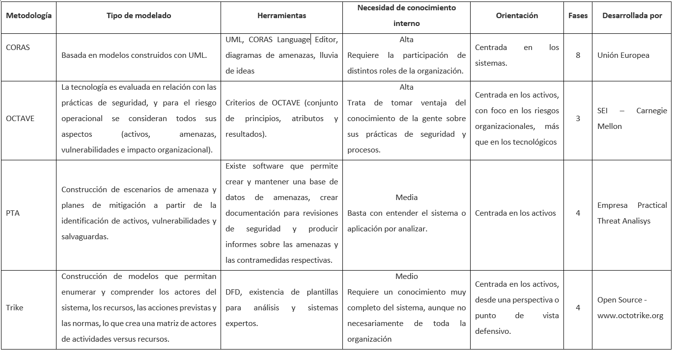 Una nota importante antes de pasar al resumen de algunas de las metodologías más empleadas: el modelado del sistema es una parte muy importante y, creo yo, es la que más diferencia a esta herramienta de otras de análisis de riesgos. En palabras de Della Corte, A. (2019), “se trata de un proceso para entender a fondo la aplicación y su interacción con otras entidades, lo que implica crear casos de uso para comprender cómo se usa, identificar puntos de entrada para ver dónde un atacante podría interactuar con ella, identificar activos, es decir, elementos en los que el atacante estaría interesado, e identificar los niveles de confianza que representan los derechos de acceso que la aplicación otorgará a entidades externas”.