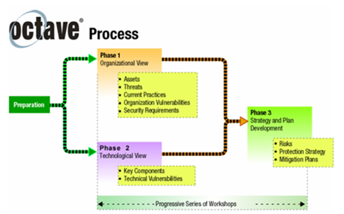 OCTAVE (Operationally Critical Threat, Asset, and Vulnerability Evaluation) surgió en el SEI (Software Engineering Institute) de la Universidad Carnegie Mellon. Se trata de una metodología centrada en activos cuyo foco está en los riesgos organizacionales más que en los tecnológicos y, a grandes rasgos, consta de tres fases (Hajrić et al, 2020):