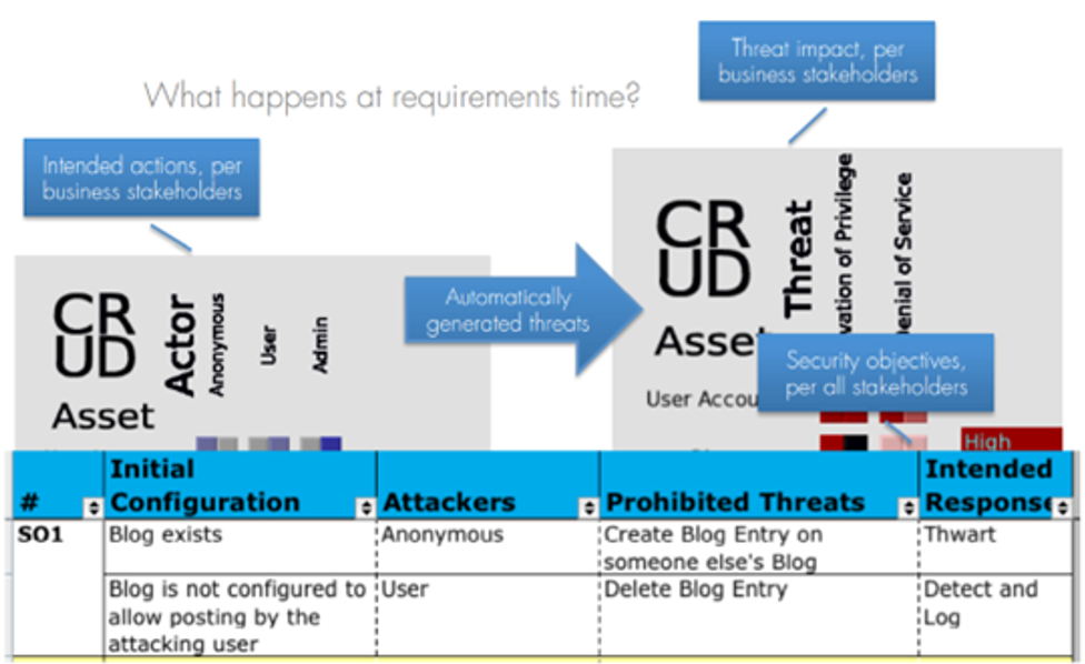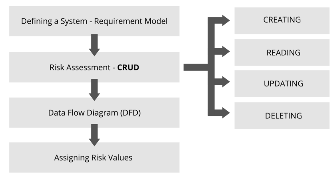 Y cada celda de la matriz se divide en cuatro secciones, una para cada acción de las siguientes: crea, lectura, actualización y eliminación (CRUD). En estas celdas, se asigna uno de tres valores posibles: acción permitida, acción ilegal o regla acción, que al final llevan a la elaboración de un diagrama de flujo de datos (DFD).