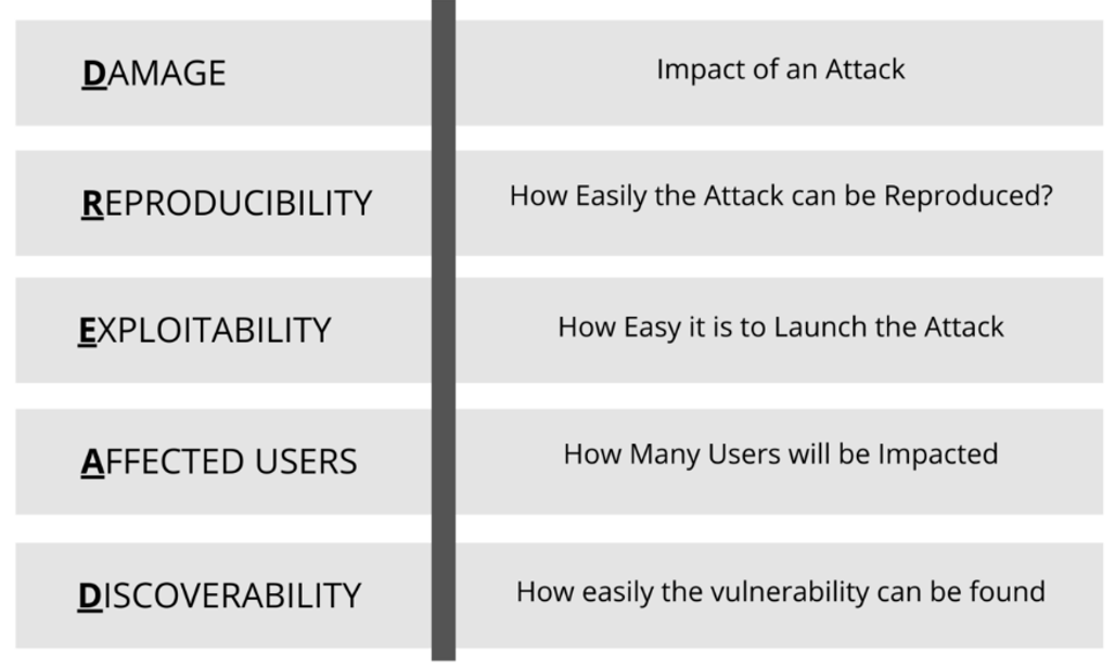 Por su parte, DREAD (Damage potential, Reproducibility, Exploitability, Affected users, Discoverability) es un modelo para puntuación que permite asignar valores al riesgo, para priorizar su tratamiento. Normalmente se emplea la fórmula siguiente: