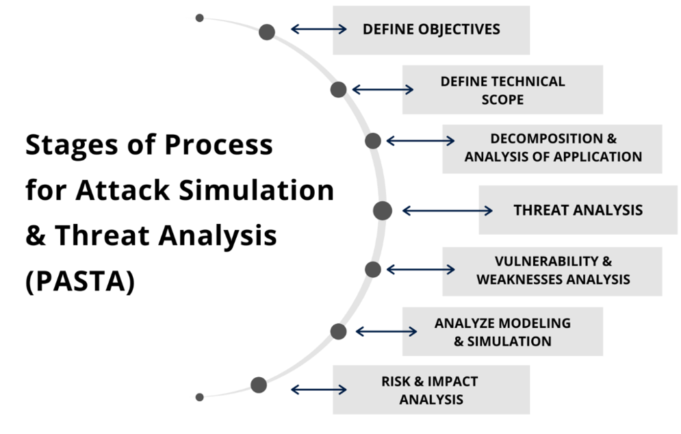 Consta de siete etapas: definir los objetivos, definir el alcance técnico, descomposición/análisis de la aplicación, análisis de amenazas, análisis de vulnerabilidades y debilidades, modelado de ataque y simulación, y, finalmente, análisis de riesgo e impacto.