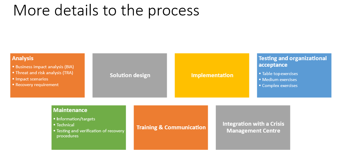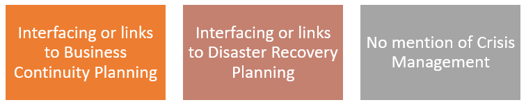 - La gestión de crisis es más que la planificación de la continuidad del negocio y la recuperación ante desastres. Esta es una parte importante de la planificación y preparación para la gestión de crisis y, por supuesto, de la respuesta de la organización.