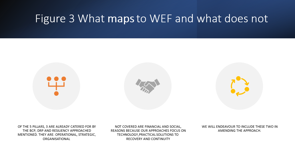 - El WEF utiliza el término resistir shocks externos; BCP y DRP es más que resistir shocks externos, también involucra eventos críticos internos que son causados también por actos internos.