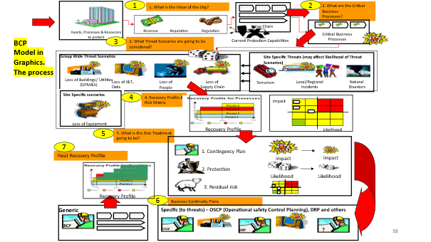 - La planificación de la continuidad del negocio (BCP, también llamada planificación de la continuidad del negocio y la resiliencia, BCRP) identifica la exposición de una organización a las amenazas internas y externas, y combina e integra los activos duros y blandos para proporcionar una prevención y recuperación eficaces para la organización, al tiempo que mantiene la ventaja competitiva y la integridad del sistema de valores (Elliot et al. 1999).