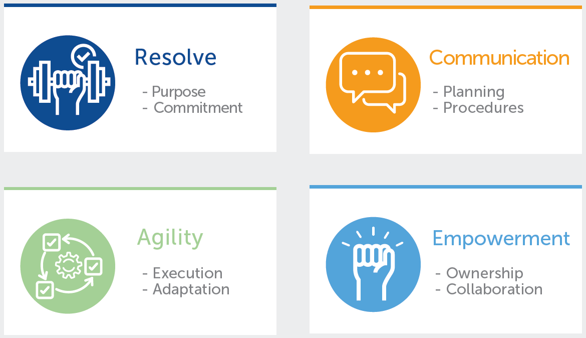 Este marco se basa deliberadamente en cuatro principios clave que serán fundamentales para que las empresas se vuelvan resilientes y sigan siendo resilientes en un futuro volátil: