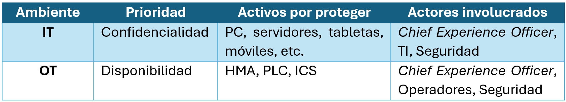 Cuando se habla de ciberseguridad o seguridad en los ICS, se deben tomar en cuenta que los entornos de ICS son diferentes en diseño, función y necesidad, por ello, no es lo mismo la seguridad en los ambientes de IT que los de OT. Si bien se persiguen los tres objetivos básicos de la seguridad como lo es la confidencialidad, integridad y disponibilidad (CIA, por sus siglas en inglés), al ser dos ambientes distintos cambia la prioridad, los activos a proteger y, claro, los actores involucrados.